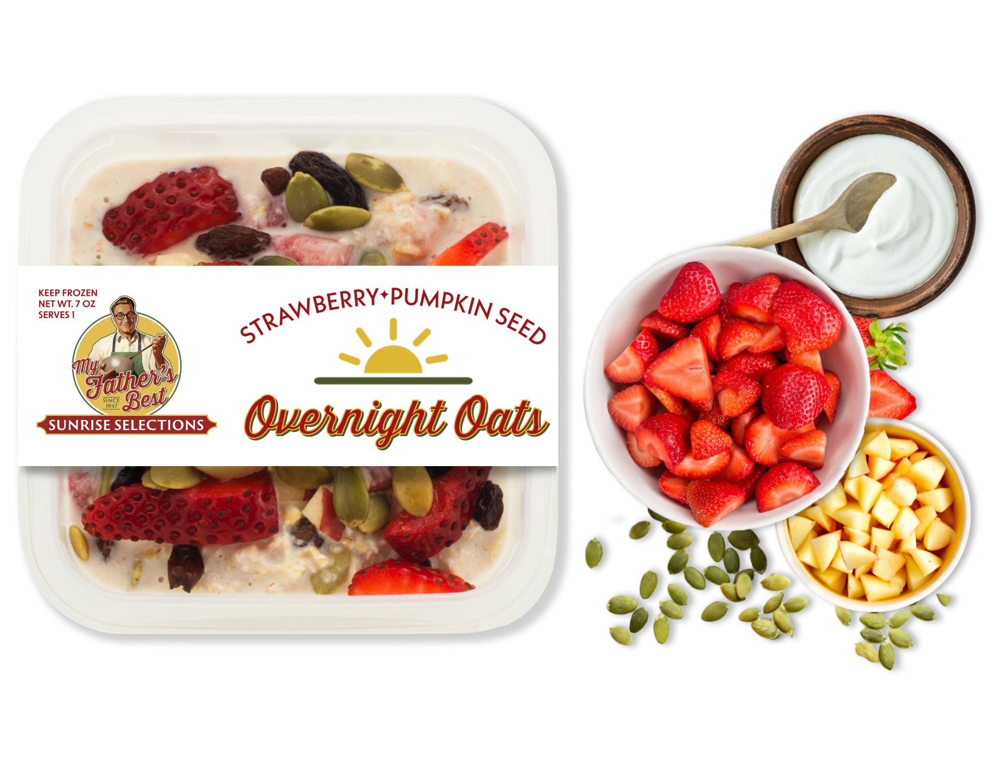 A European favorite: Rolled oats, almond milk, and non-fat Greek yogurt, mixed with diced apples, fresh strawberries, sweet raisins, and crunchy pumpkin seeds. With no added sugar, they’re naturally sweet and simply delicious whether eaten chilled or heated.